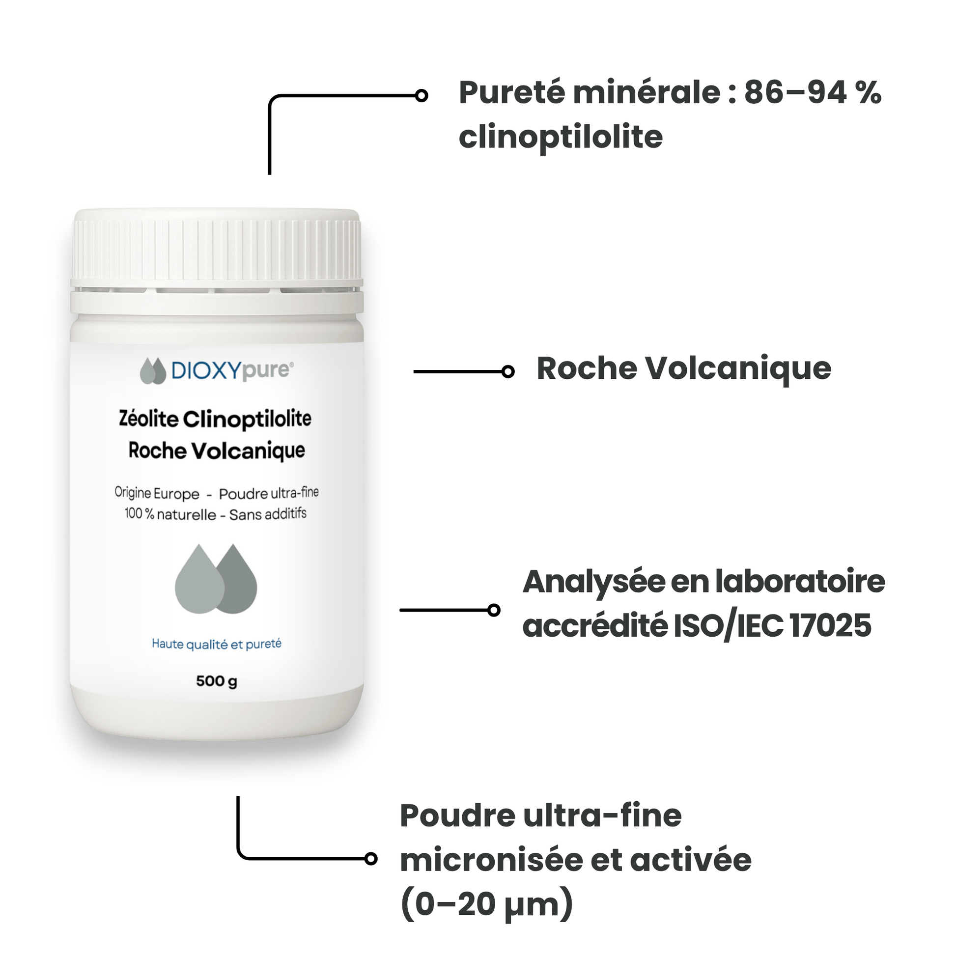 Il s’agit exclusivement de clinoptilolite naturelle d’origine volcanique, micronisée et activée, sans transformation chimique.